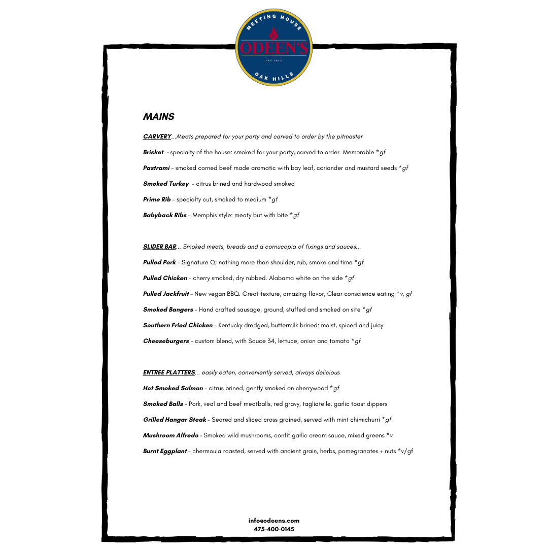Looking for a party venue? Look no further than the beautiful space at Oak Hills! Take a look at these fun, time tested menu options and we’ll take care of the service, so you and your guests can concentrate on enjoying yourselves!